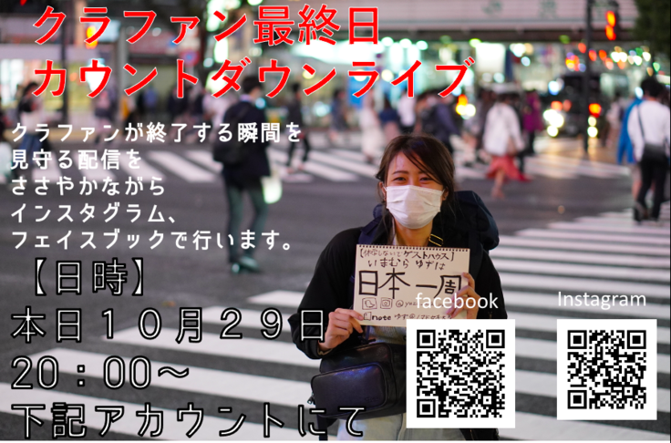 日本一周を行うクラウドファンディング、最終日にして、感謝を伝えるカウントダウンライブ配信を行います。(8時に終わると思ったら24時でした。カウントダウンはできねえ)(起きてたらやる)