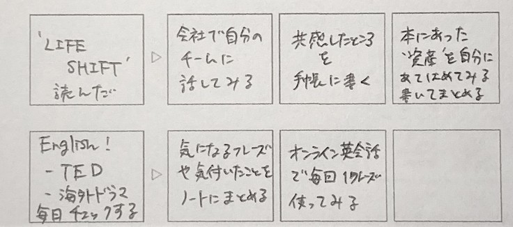 でも「そつなくできること」よりも「ちょっとだけ勇気を出せばできること」を書き込む方が0.5歩前に進む気がします。