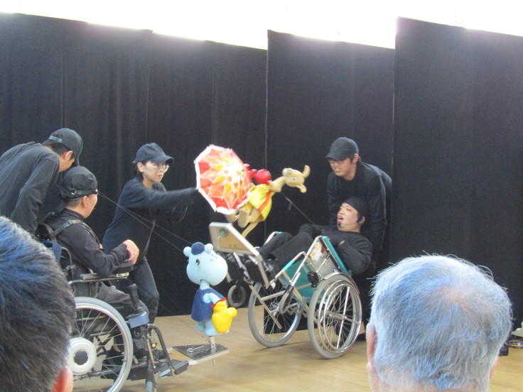 人形と障がいのあるメンバーが人形を操り、ストーリーに合わせて車イスを動かす施設職員が協力し合って演じる三位一体型で舞台をいっぱいに動きながら表現するというスタイルが大きな特徴です。