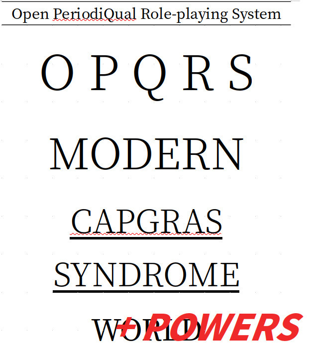 OPQRSや世界設定のCAPGRAS SYNDROMEにはSuper Powerなどの設定は含まれていません。Super Powerなどを導入するPOWERSサプリメントを導入することで、CAPGRAS SYNDROMEにもSuper Powerが存在するものとして世界設定を行ないます。