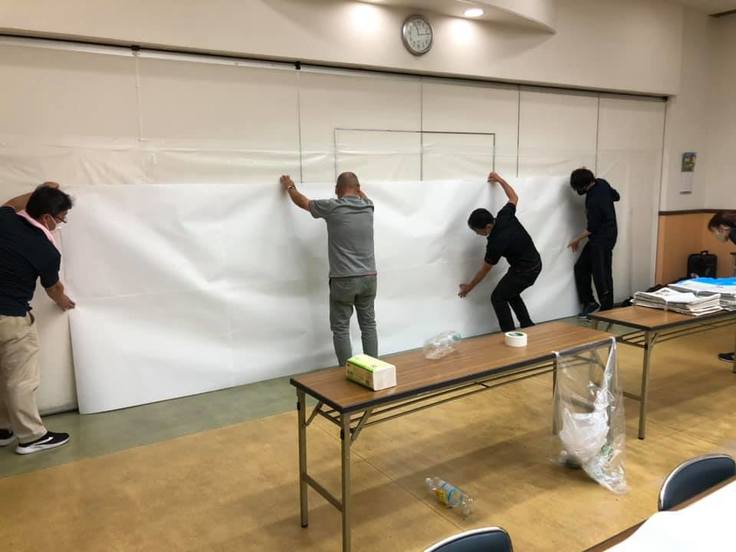 現在、みんなで昼食をとっています。カメラがセッティングされ、壁面に大きな模造紙が貼られています。