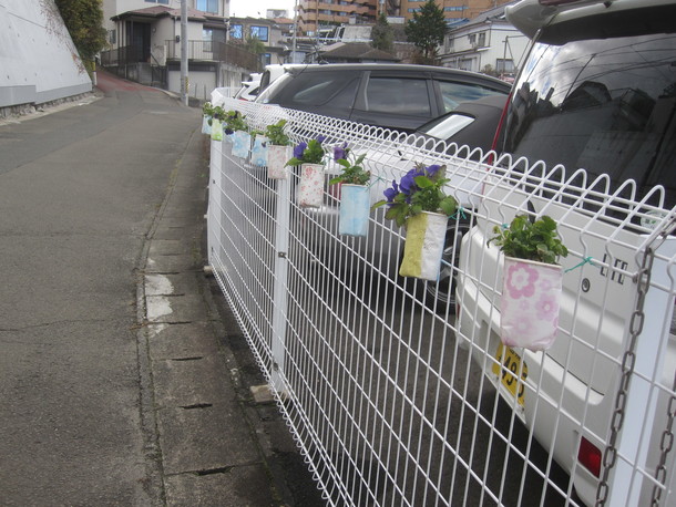 咲かせようの公開日に、びっくりの地震でした。25日にフェンスのお花に水やりでHondaCars様の駐車場に出かけると、あの地震の強い揺れにも問題なく、落下することもなく、ビオラ、パンジーがしっかりと咲いていてくれました。皆様にも安心して報告ができます。セットして20日となりました。