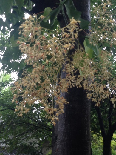 雨上がりの境内では、アオギリの大木(左)が緑の葉っぱを輝かせていました。花を見るのは初めて。築200年の本堂の前でこちらを見ていた水鉢のハスも恵みの雨に生き生き。