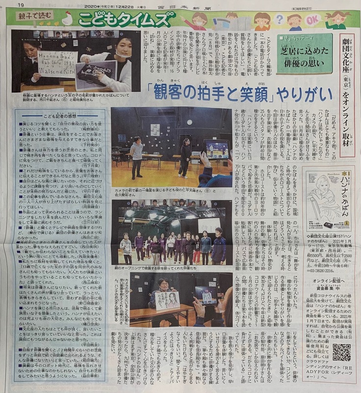 ある日、プロ棋士の藤井聡太さんを、子供記者さんがインタビューしているのをテレビで見て驚き!!ハンナと同じ年頃の子供たちに作品の取材をしてもらえないかと「東京にも子供記者さんはいるんですか??」と西日本新聞の東京支社に思わず電話したことがきっかけで、こども新聞担当の中野様とお話することができ、「東京にはいないのですが…西日本新聞の子供記者さん達が、ご自宅にいながら取材ができますよ!」と、オンライン取材を提案していただきました!!