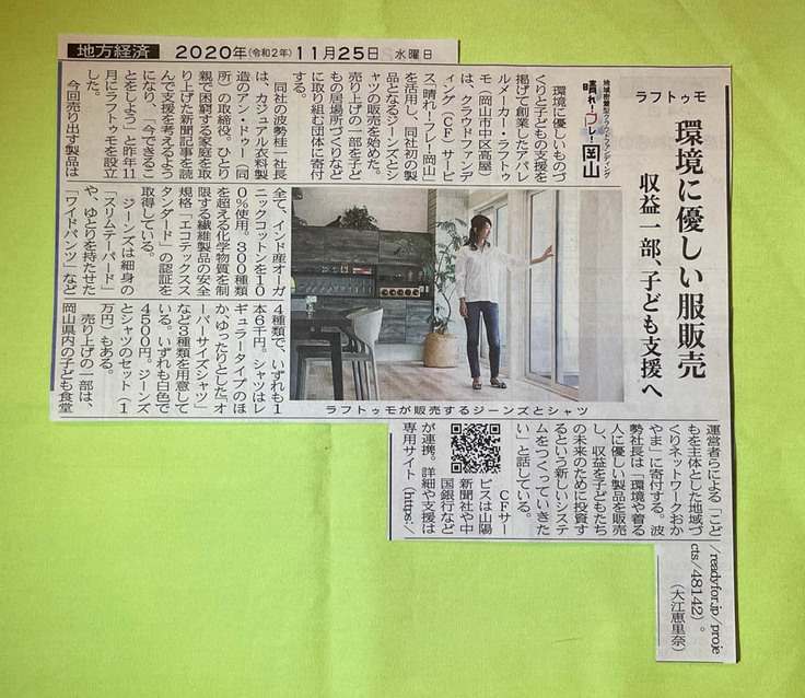 地域密着型クラウドファンディング 晴れ!フレ!岡山の一環として、山陽新聞でサステナブルアパレルメーカー「ラフトゥモ」の取組みを紹介していただきました!