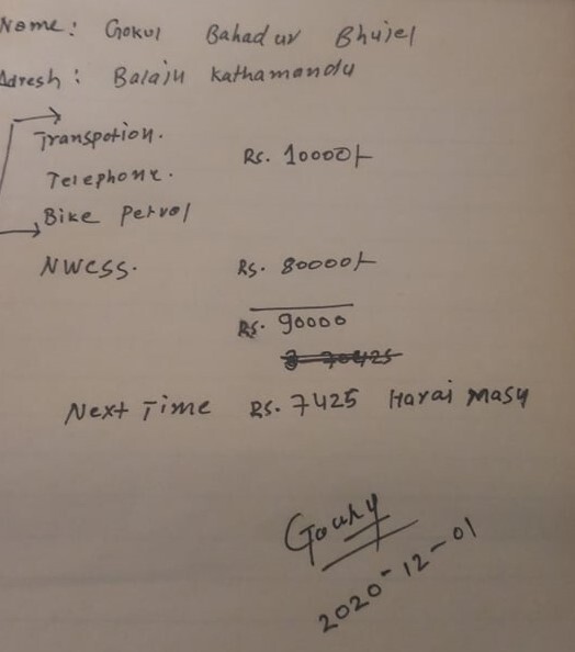 残りの17,425 NPRは、10,000 NPRを孤児院への連絡時の通信費、運搬費、バイクの燃料代として使用させていただきました(残りについてはレシートが届いていないので、1月分の使途と併せてご報告いたします)。