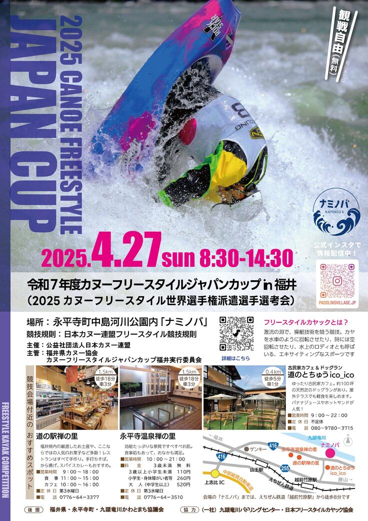 九頭竜川かわとまち協議会(会長:河合永充・永平寺町長)は、2025年4月27日(日)に、福井県永平寺町の九頭竜川に整備したカヤック競技場「ナミノバ」にて、日本カヌー連盟主催『カヌーフリースタイル ジャパンカップ』が開催されることをお知らせいたします。
