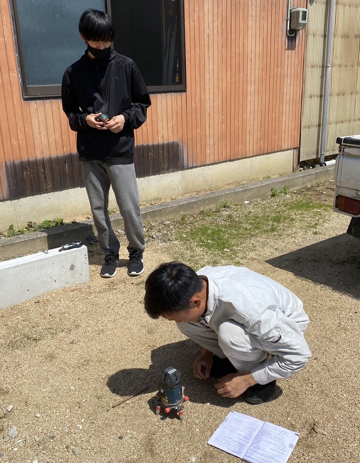 そのあと、どこまでの高さを床にするのか、外構部分に墨付けをしていきました。レーザー水平器などを使い、結構本格的な作業です。。。