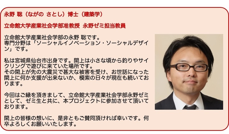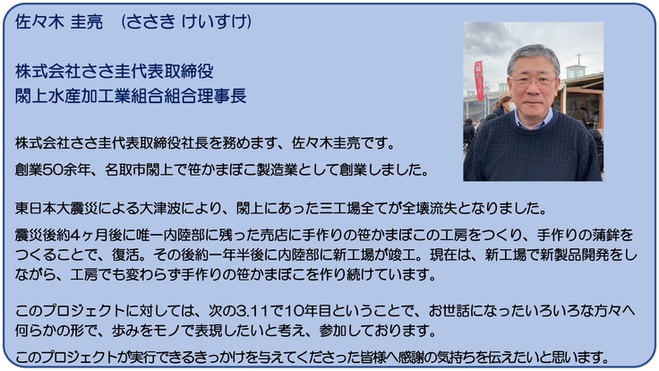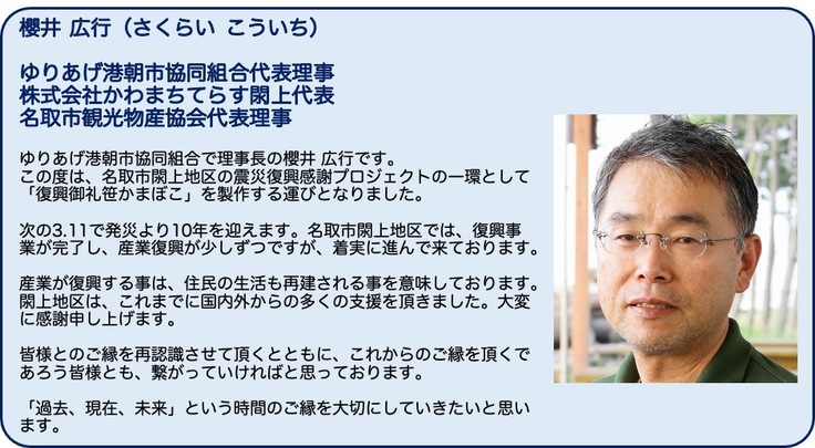 復興から交流へと架橋する新しいプロジェクトに対して、皆様の温かいご支援を賜りますよう、何卒よろしくお願いいたします。