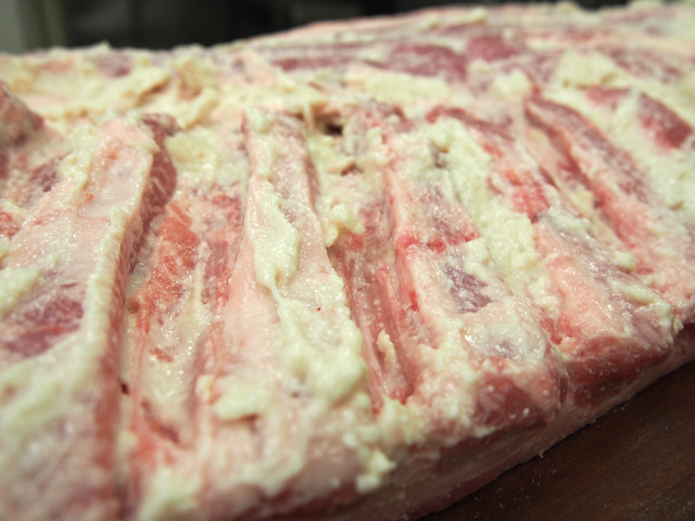工房全体に広がる酒粕の香りのなか、厳選された国産豚のバラ肉に丁寧に丁寧に夢遥の酒粕を仕込んでいきます。