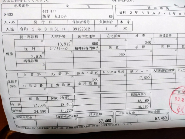 母の入院費(8/16~8/31)