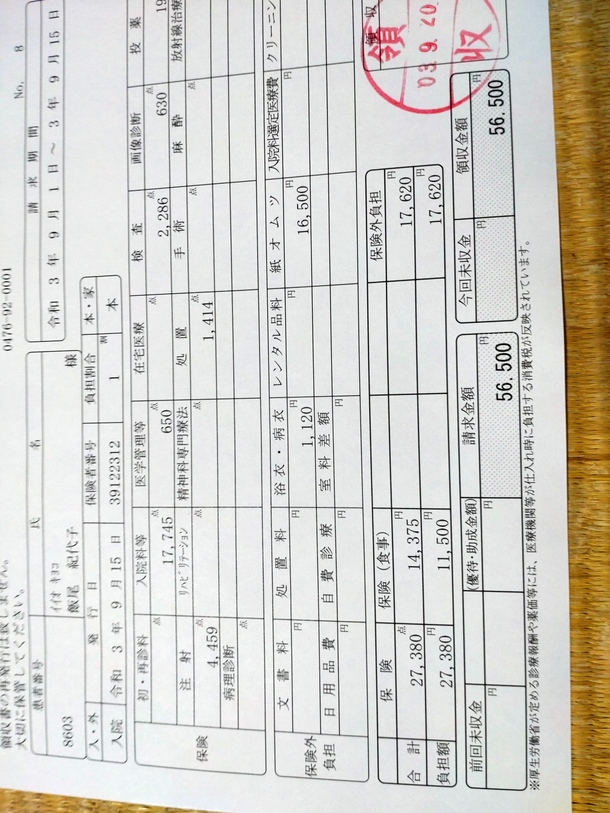 9/1~9/15 入院費の支払いの為に、