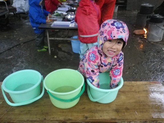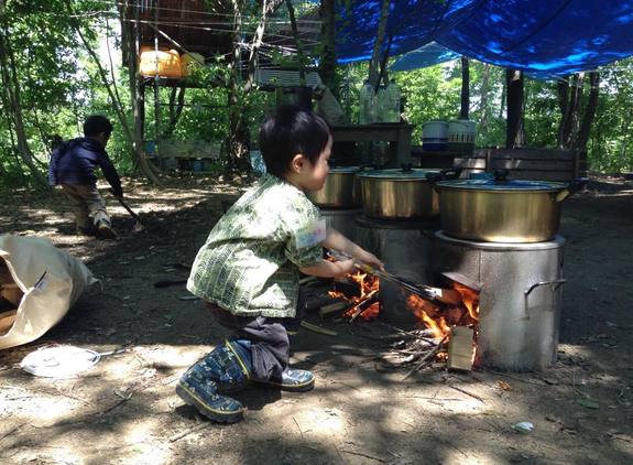 登園すると子供たちはまず、火をおこし、薪を投入して野菜を切り、お味噌汁の鍋を火にかけ、午前中は外で過ごします。広い広い森の中に大人の足でも歩いて最長1時間ほどはかかるトレッキングコースがあり、散歩に出かけたり、