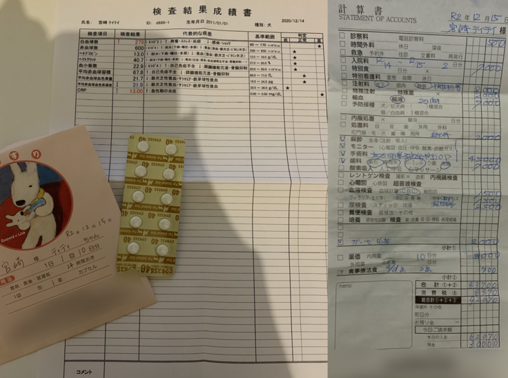 診察代、手術費、入院費1日分、お薬代、今後の術後通院費は