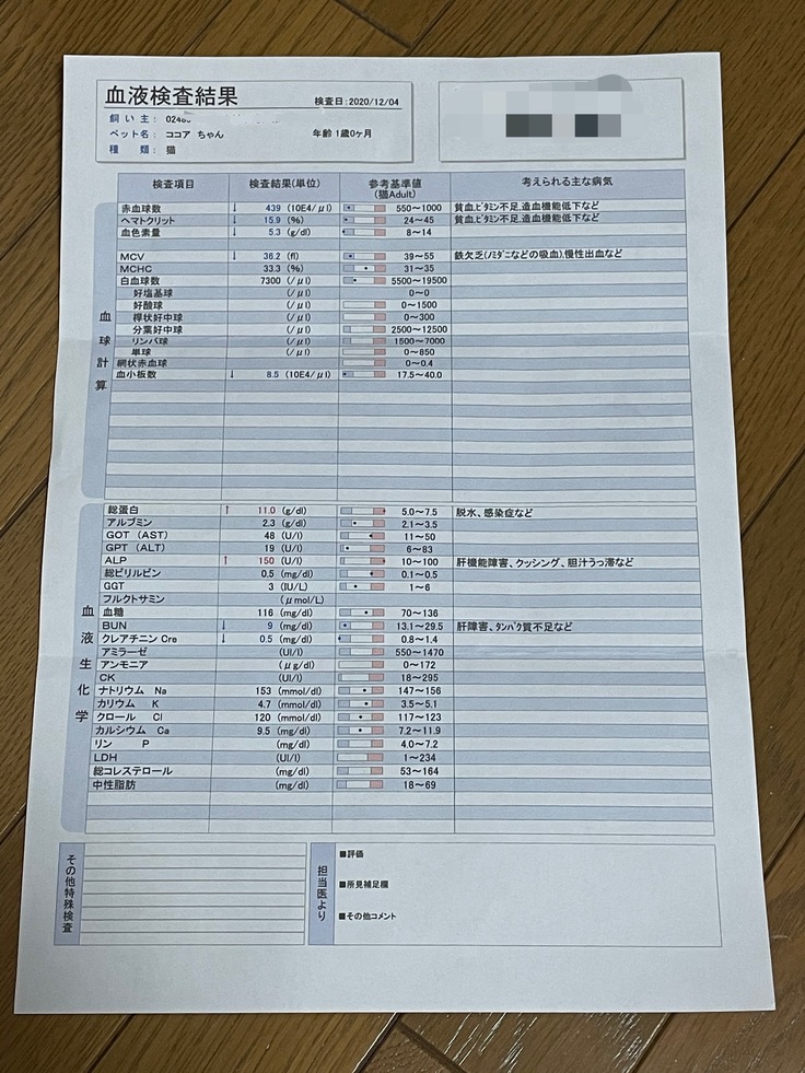 基準値を下回り酷い貧血を起こしていること、総蛋白の数値が高いことから