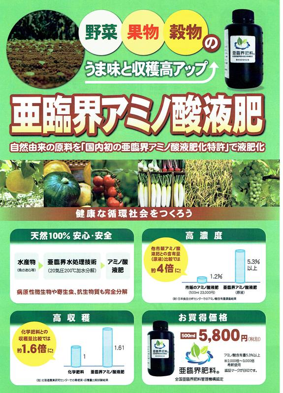 この度「亜臨界アミノ酸液肥」という「エコに元気な作物を育てる」新しい技術を導入し、この技術の促進に取り組んでおります。