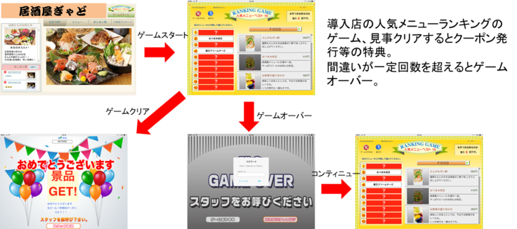 広告のランキングゲームはお客様がゲームクリアすることにより、そのタブレット端末を置いてある居酒屋さんに広告料が入る新しい仕組を作り居酒屋さんのコストの負担を軽くします。