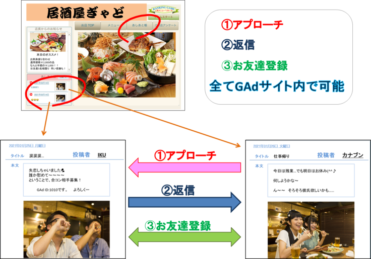 GAd導入店の検索や紹介だけではなく、SNSで会員同士は勿論、導入店、広告主、を繋げる事により全方向型で色々な使い方が可能なサイトを作ります。