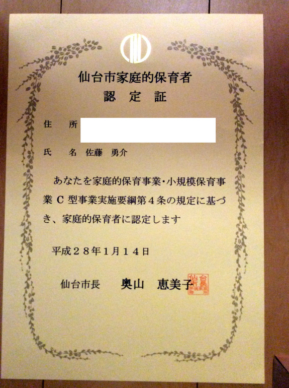 認定証をいただき、正式に家庭的保育事業者として認定されました。