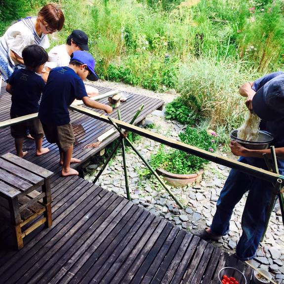 敷地内の竹林の竹を使って、自家製の流しそうめんをしている所。