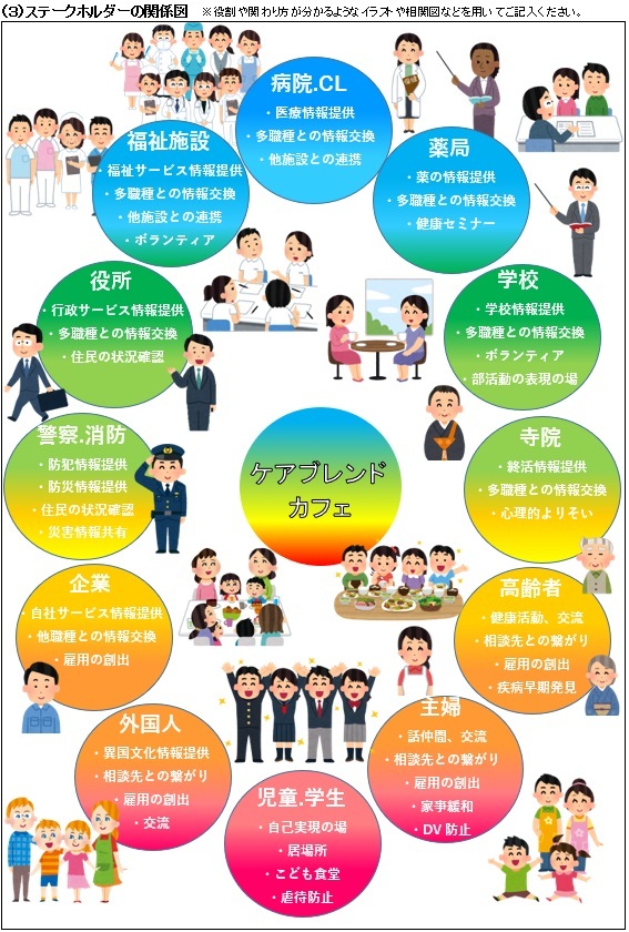 医療系、福祉系従事者の参加はお互いが情報共有するきっかけとなることや、双方とも住民と接することで情報提供、状況確認などが行え、多業種においても同様に専門的な知識、技術の提供、共有され、住民はそれらのサービス内容を知るきっかけや、有事の際の相談先との繋がりを作れるようになります。 参加の壁となっているのは実務の多さもさることながら、家族にかける時間が必要であることが要因となっており、親子で参加できる仕組みとして、高齢者や児童が参加できるよう、子供食堂や健康セミナーなども並行して行うようにしました。 仕事に就いている方々だけではなく、地域にとって高齢者も児童も大事な存在であり、高齢者の健康寿命を延ばす取り組みや、児童が地域の大人と接する時間は地域に対しての関心を育むことに繋がります。 また、中高生においても同様に部活動の発表の場や、自己表現の場としての活用、大学生、専門学生においても社会人との出会いにより雇用創出、職業選択の幅の拡大に繋がる可能性もあり、カフェ(集まり)を2部制(時間帯によって区切る)にすることで、大人達が参加していない時間帯を居場所として活用できる仕組みもあります。