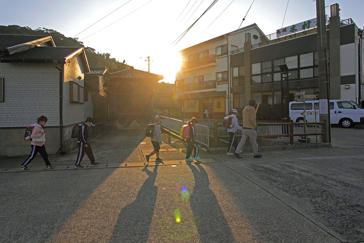 『朝の集団登校』沼島は小さい島ですが、南区、中区、北区、東区、泊区と5つの地区に分かれています。春祭りは5地区の「曳きだんじり」や担ぐ「かきだんじり」とともに地区毎練り歩きます。また、夏の盆踊りも地区毎の踊り場が設けられます。多分、この子達は泊区、東区、北区、中区の小学生が中区の港で待ち合わせて、南区にある小学校へ集団登校する光景かと思います。