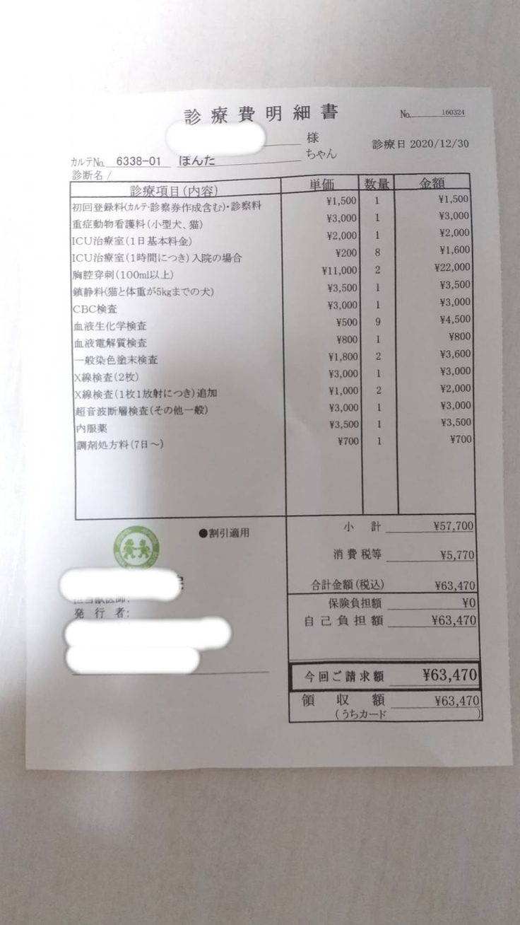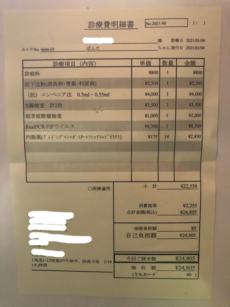 2020年12月30日急にぽんちゃんの呼吸が荒くなり苦しそうにしていて、朝一番で受診しました。胸水が溜まってて危ない状態でした。レントゲンを撮ったら肺が真っ白で300mlくらい水が溜まっていてぬいてもらいました。その日はICUに入って退院になりました。胸水が溜まった原因がFIP(猫伝染性腹膜炎)か悪性リンパ腫と言われました。年末休みに入っていたので検査センターに出す事ができずステロイドの内服薬をもらいました。