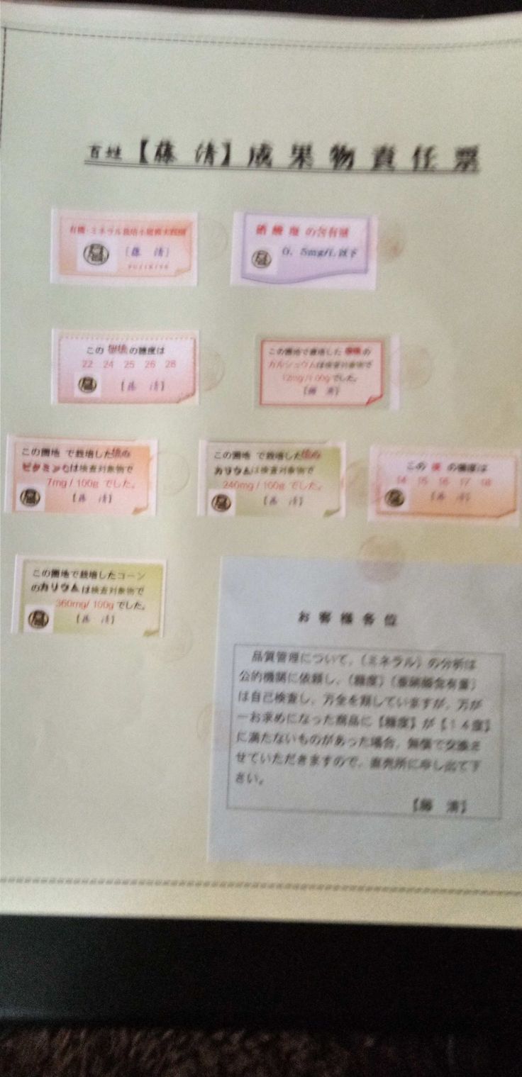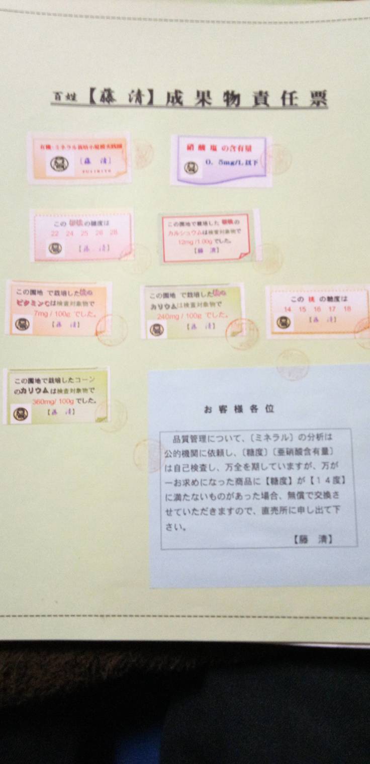 「伊藤清毅」の糖度・ミネラル含有量等の表示書 (ミネラルは公的機関の分析数値)