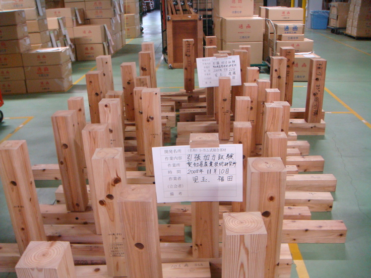 ②試作品での本申請部材、仮称「S-カム内蔵式こみ栓」は (財)日本住宅・木材技術センターで性能評価試験を受けていますので許容応力度設計(木造3階以上))の構造計算が可能になります。