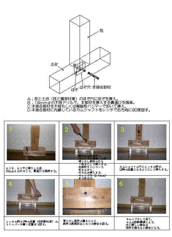 ③ 本製品のカムによるコマの飛び出しは、日本の伝統木造構法の「こみ栓接合」の技法と同じように柱を横架材に引寄せて密着させる機能があります。
