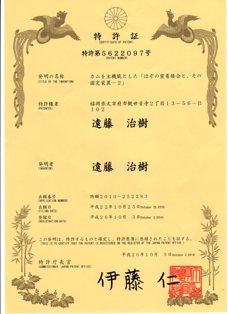 ②8年前に事業者が取得した特許;第5622097号【カムを主機能とした「ほぞの密着接合とその固定装置-2」】を活用して、法隆寺創建来約1400年の伝統の技法を継いだ構造計算ができる耐震接合部材、仮称「S-カム内蔵式こみ栓」を特許権利者の福岡市の個人事業者;福岡アーキテクツと東大阪市の製造所(金型と射出成型)とコラボして製品化する計画です。
