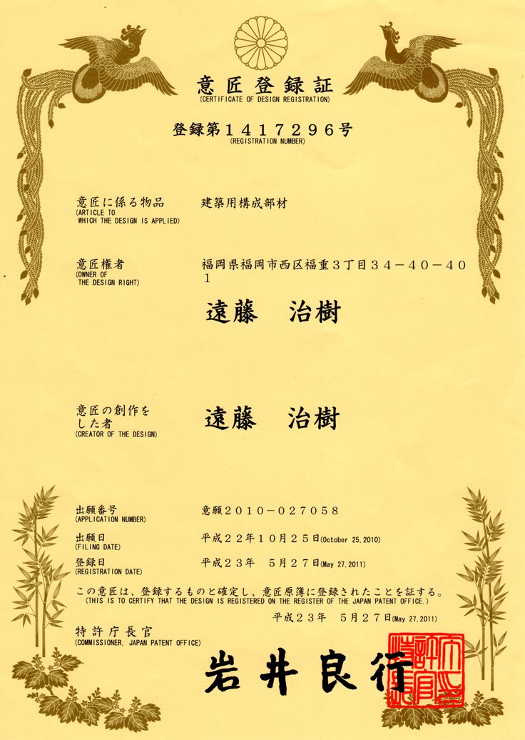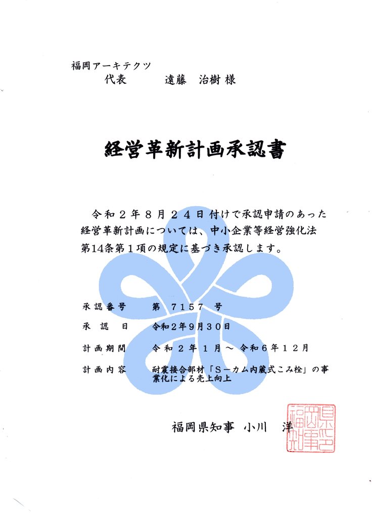 ①今回の事業は、製造所に特許許諾も考えましたが、建築基準法上の知識がないと世の中に誤って伝わると考え、考案者自身が製造者になると決め、2年前、2019年に福岡アーキテクツ(個人事業主)を起こしました。2020年9月、福岡県経営革新承認 を受けた事業でもあります。
