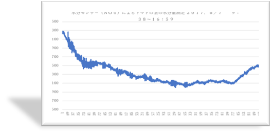 このデ-タより茎内の水分量の変化が日射、温度等によりリアルタイムに変化していることが分かりました。