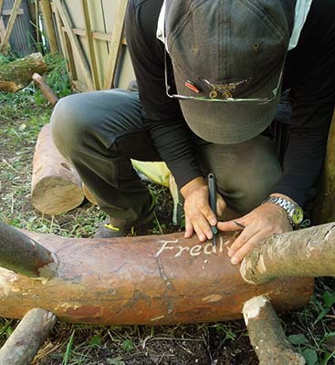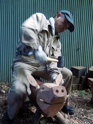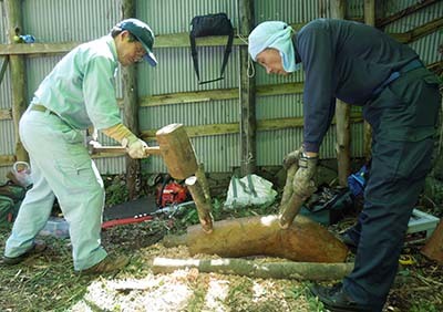 丸太を山から作業場まで下ろし、穴を電動ドリルで穴を開け、太い枝を削って足と首を打ち込む。これが<きこりの木馬>の作り方。ただし材料はすべて曲がった広葉樹のため、材料選びも穴開けも結構たいへん。しかも堅い! そこをめげずに丸太と格闘しています。