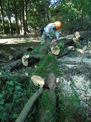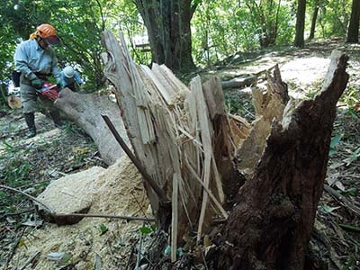 <きこりの木馬>の古里は、箱根九頭龍の森。芦ノ湖畔に広がる広葉樹の森です。この森には、ヒメシャラ、ケヤキ、オオモミジ、ミズナラなどの大木が根を張っています。しかし、その命は永遠というわけではありません。台風や爆弾低気圧、大雪などが襲来すると、根こそぎ倒れたり、大枝が折れたりと被害を受けます。