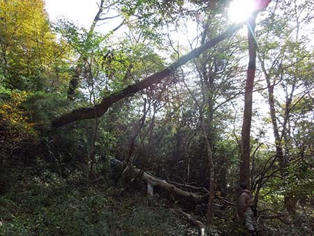 爆弾低気圧がもたらした強風が森の中の枯損木を倒し、散策路脇のヤマグワの掛かり木になってしまいました。どちらもそこそこの大木。枯損木はヤマグワの二股にしっかりとはまり込み、垂直方向に重心が固定した結果、ヤマグワを伐っても全く傾かない状態に。