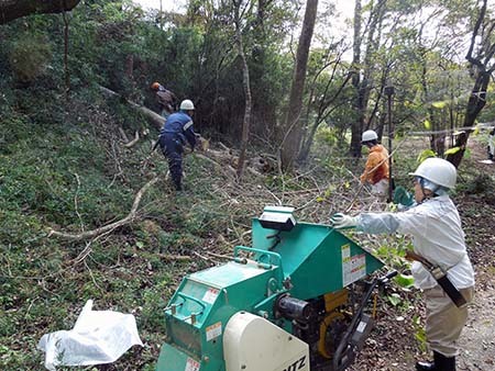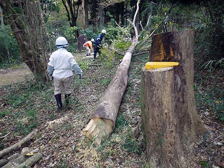 このため、さらに慎重に伐り離し、切断した上部にチルホールを掛けて引っ張ると、2本とも一気に崩れ落ちました。この枯損木、すでに枯れてから数年が経過しており、腐朽が進んでいたのですが、高さ15メートル、根元は直径80センチもあり、危険な存在でした。