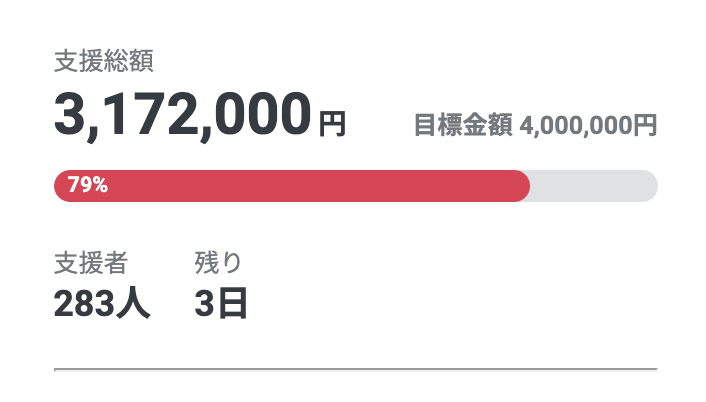 残り日数は少なくなりましたが、皆様の想いを受け止め、必ず達成できるように頑張ってまいります。皆様からの拡散のご協力も、達成に向けてとても大きなアクションにつながります。