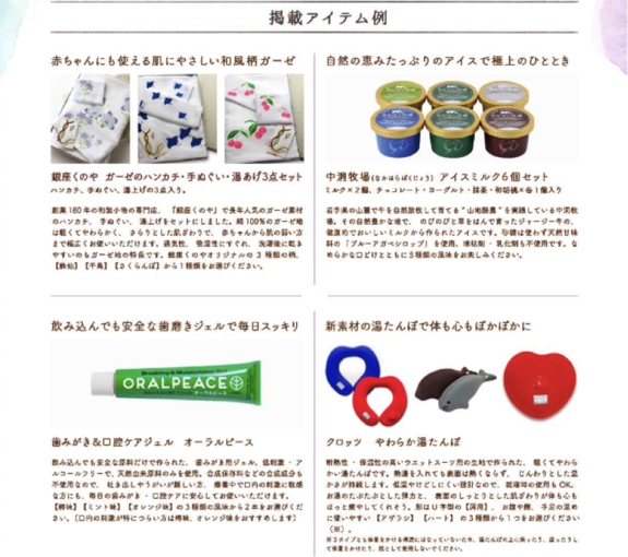 ★工夫1:20~40歳代女性の病気経験者や医療者たちが選んだ、「入院・療養中にちょっと気持ちを上向きにしてくれる素敵グッズ」が選べるカタログギフトです。例えば、このような商品が掲載されます。
