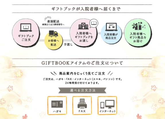 そして、遠くて実際にお見舞いに行けなくても、郵送でギフトブックだけを送り、心を伝えることができます。注文は、ハガキ・FAX・WEBサイトから受け付けているので、入院・療養生活を送っている方にも使いやすいようになっています。