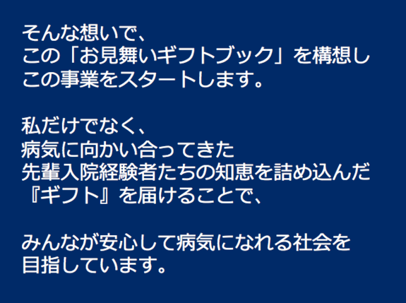 病気を経験した方々の声をしっかりと吸い上げて『お見舞いギフトブック』をつくりあげ、必要な人たちに価値を届けていきたいと思います。