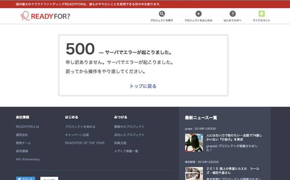 本日、ご支援いただける方の数名から「500-サーバーでエラーが起こりました」という事象が発生しているとご連絡を頂いております。READY FOR事務局に確認して、現在エラーは解消され、入金可能な状況となっております。皆様には、大変ご迷惑をおかけいたしました。