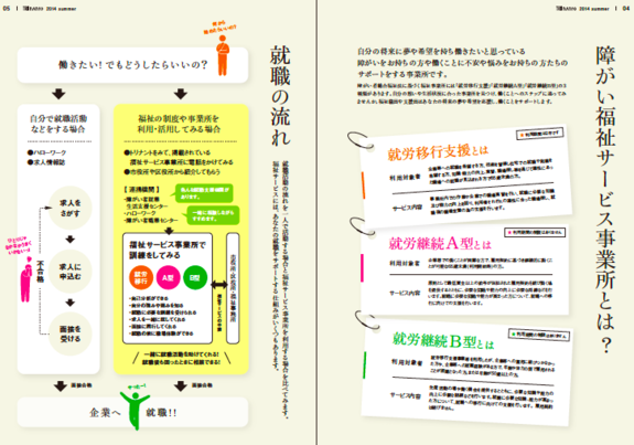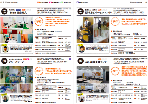 こうした活動の一環として、2014年には、様々な職場の紹介や就職までの道のりなどを紹介する情報誌を作成し、京都市内の病院や学校など箇所で無料配布を行いました。第1弾を発行すると、「どこに相談すればいいのかわかった!」や「どこに、どんな支援事業所があるかわかりやすくていい!」といった声も多く聞くことができました。