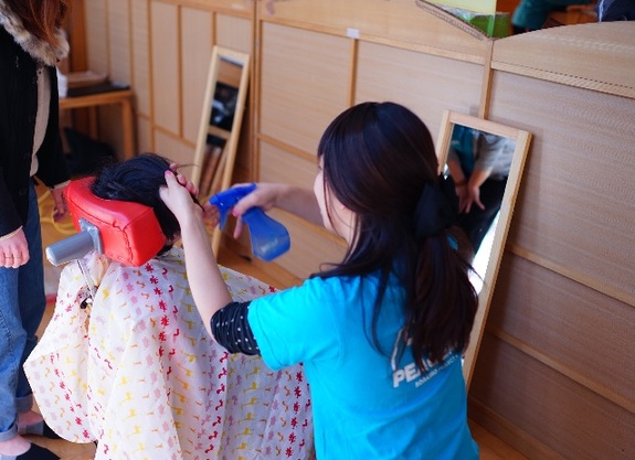 (理美容室が苦手な障害のある子供たちが少しずつ慣れるように、保育園などへ出張してカットする美容室を取材している様子です。)