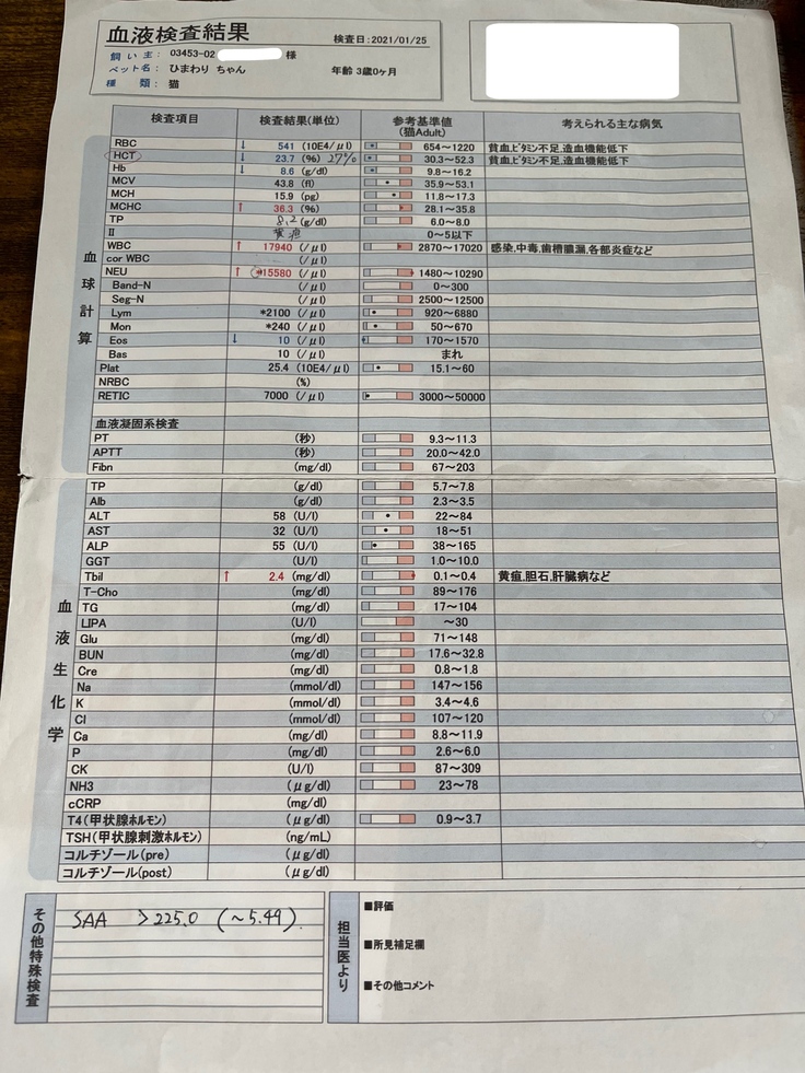 炎症の度合いを調べる猫α1AGが2000以上と基準値を大幅に超えています。