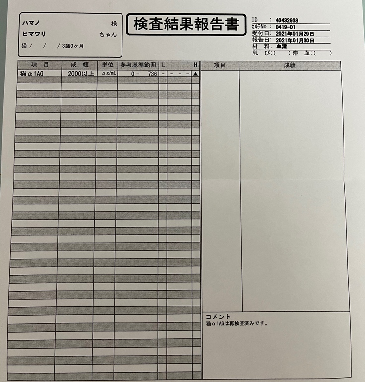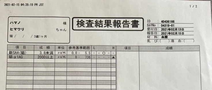 SAAは正常値になりましたが、猫α1AGの数値は2000以上とまだ高く正常値ではありません