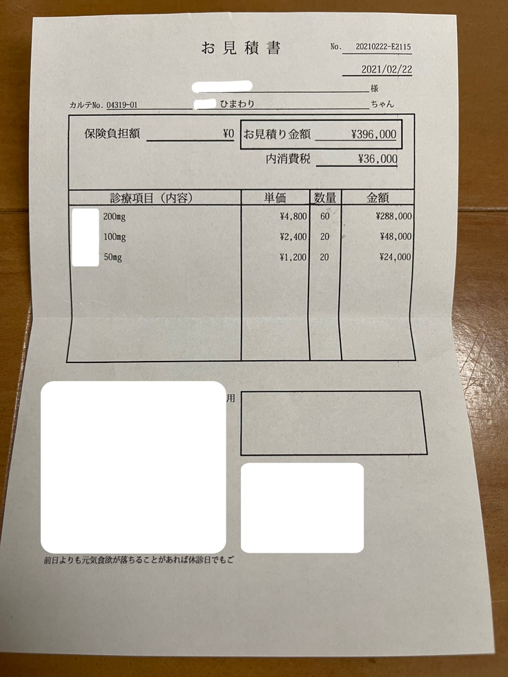 私はヒマワリを絶対に助けたいという気持ちと、とても高額な薬代を用意できるのかという不安を抱えながらその日は帰宅しました。