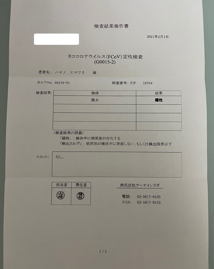 「腹水をFIP検査し、結果が出るのは約1週間後です。FIPは進行がとても早い為