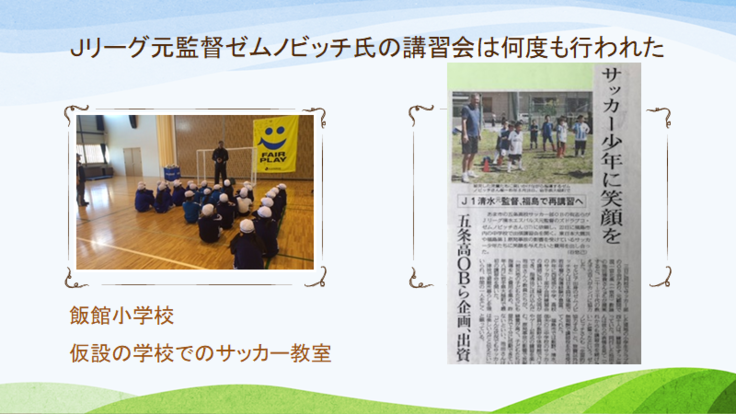 まず、東日本大震災以降、継続して福島に支援して頂いている池田博貴先生に感謝申し上げたい。池田先生との出会いは思わぬところからでした。当時勤めていた中学校へ池田先生から突然の電話、それはフランスで昼食時に交わした中学生との会話からという奇跡的なものでした。そこから支援の話はトントン拍子に進み、ゼムノビッチ氏の白河市立白河中央中学校でのサッカー教室、池田先生主催の名古屋遠征、佐藤隆治プロフェッショナルレフリーの葛尾村立葛尾中学校、郡山市立明健中学校訪問と実施されました。その際の支援は参加した生徒や保護者が一様に笑顔になっていました。それこそが本物の支援だと感じられました。