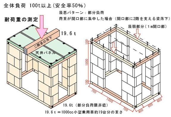 上の断面図のように天井パネルを支えるブロック壁面の上に乗っかかるような形であれば、問題なく2階部分の総重量でも支えることができます。